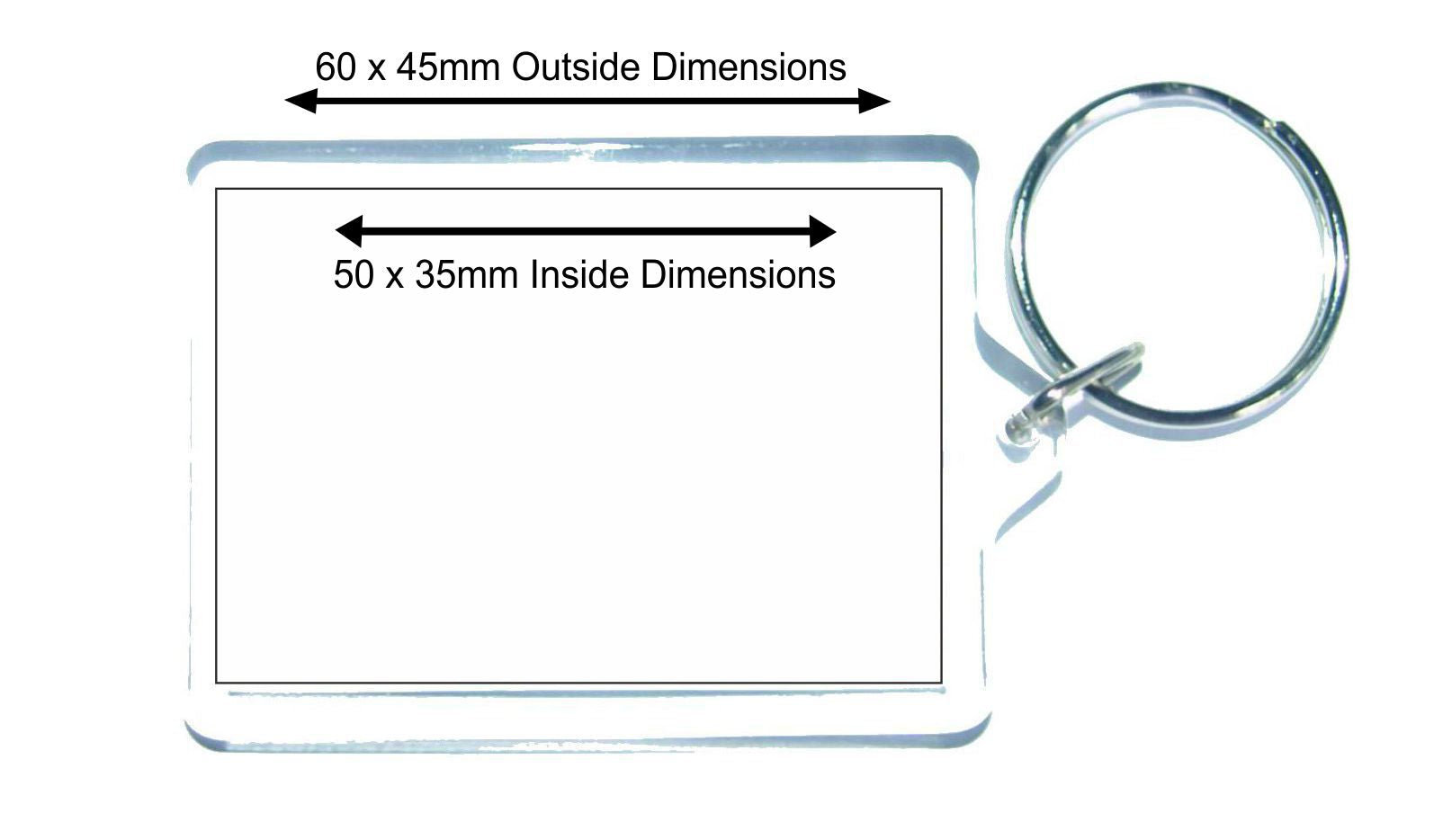 This keyring is made from clear/transparent acrylic and features a metal ring for attaching keys or tags, etc.