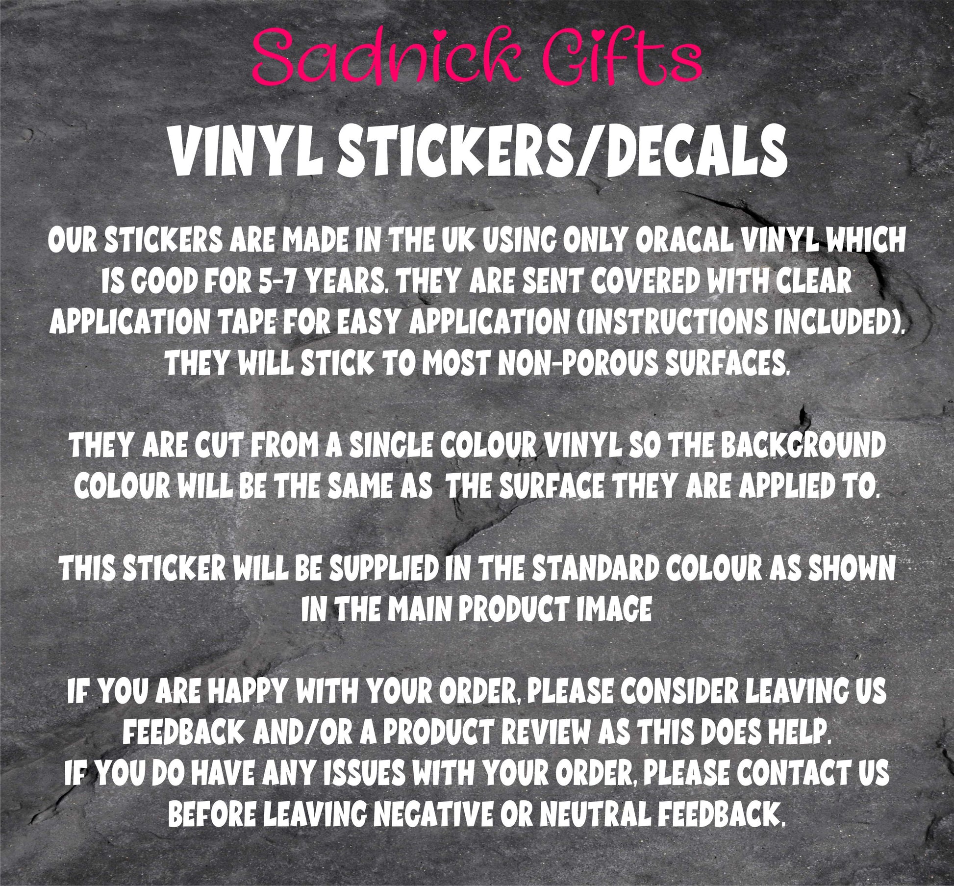This novelty vinyl sticker will stick to almost any non-porous surface such as glass, vehicle bodywork, smooth plastic, kitchen/bathroom tiles, cupboards, mirrors, laptops, etc.