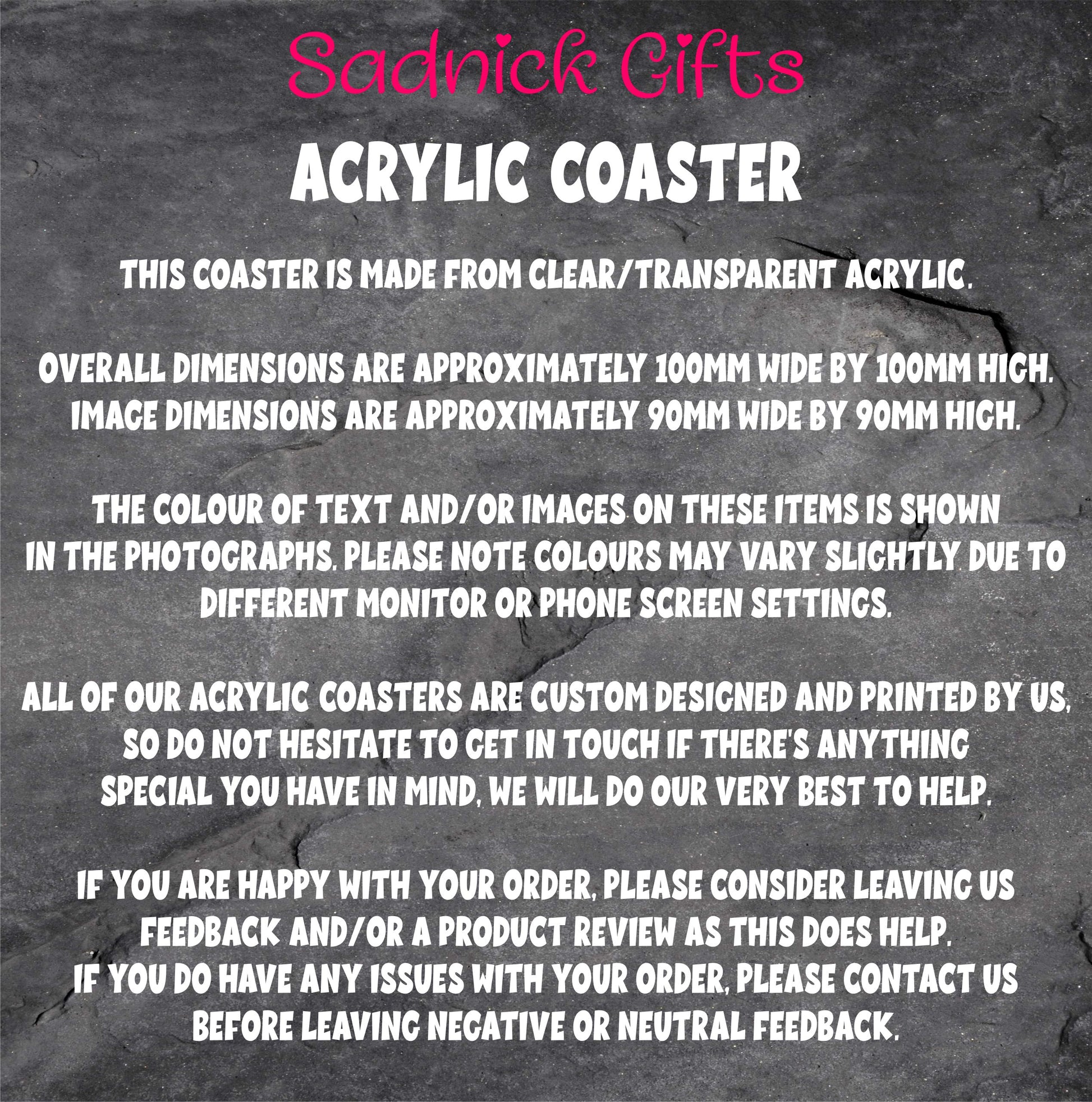 Give this gift with love and put a smile on someone's face every time they read it. This lovely Coaster makes an amazing Birthday or Christmas gift but is also a great gift for anytime of the year. A beautiful keepsake that will be treasured for many years. Give this gift with love and put a smile on someone's face letting them know of your love every time they read it. All of our acrylic coasters are custom designed and printed by us, so do not hesitate to get in touch if there's anything special you have in mind, we will do our very best to help. Whether you are buying for that awkward relative that you only see once a year at Christmas or if you are gift hunting for that funny work colleague for their birthday, you are guaranteed to find the ideal, high quality, coaster design for them with us here at Sadnick Gifts.
