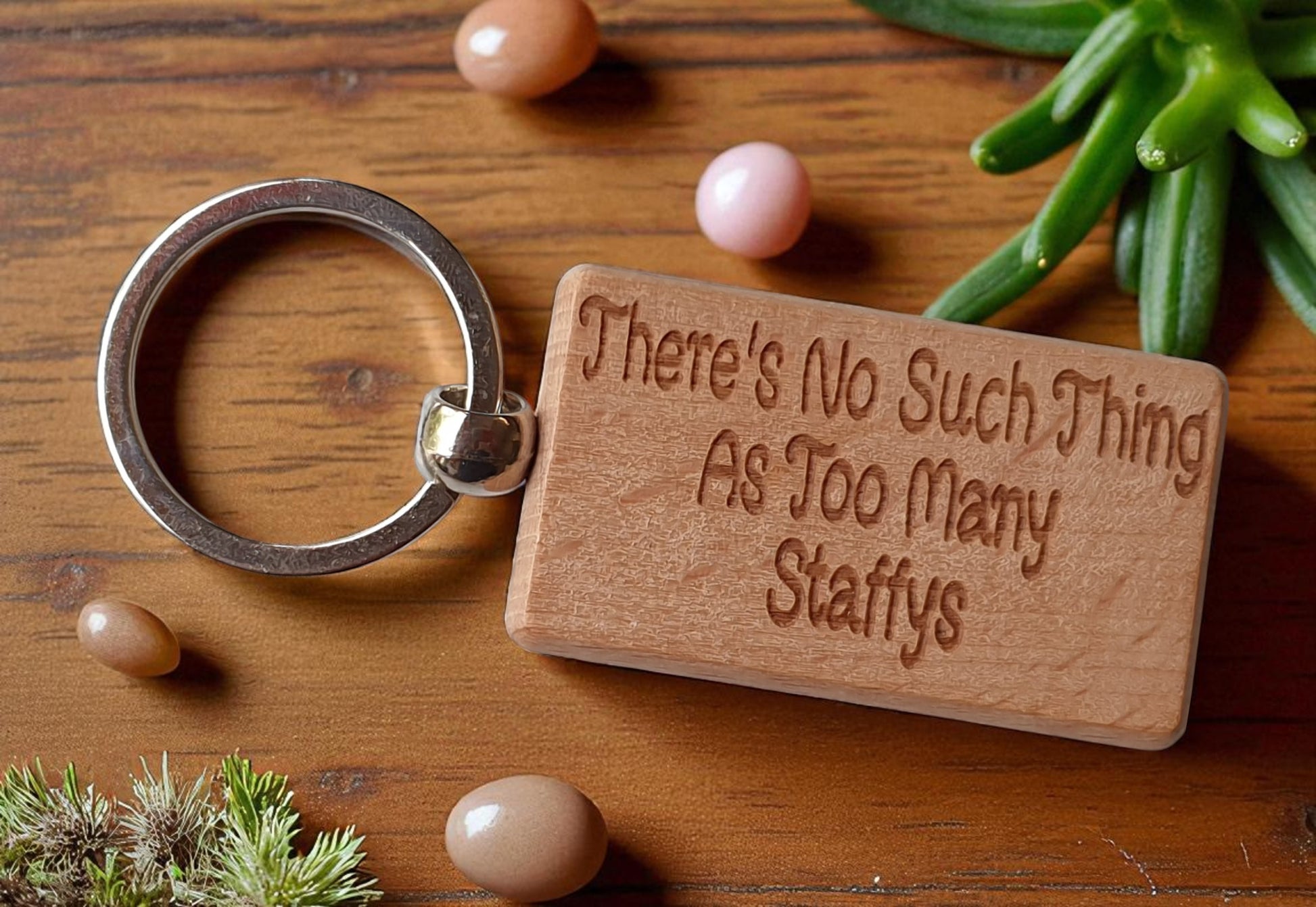Staffy Keyring Gift There's No Such Thing As Too Many Nice Cute Engraved Wooden Key Fob Novelty Dog Owner Present